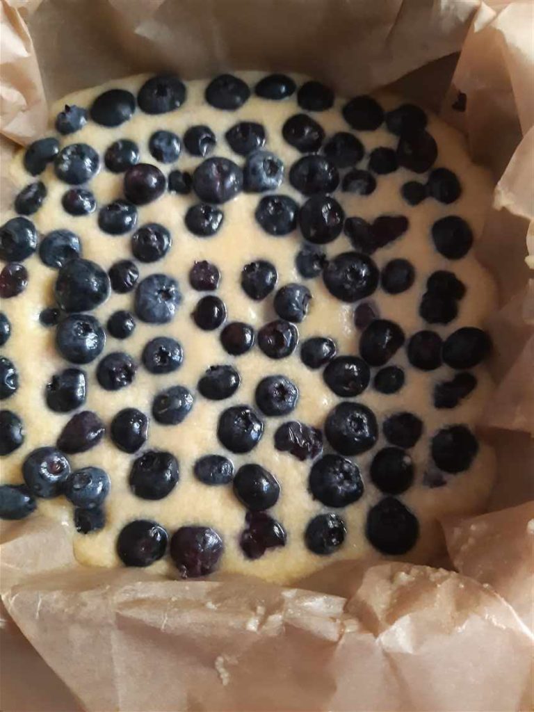 La sfârșit se pot adăuga fructe (eu am folosit afine), amestecând până la distribuirea uniformă, apoi se toarnă aluatul într-o formă tapetată cu hârtie de copt. Pandișpanul se coace la foc mediu (circa 170 grade C), până se prinde și rumenește suprafața.
