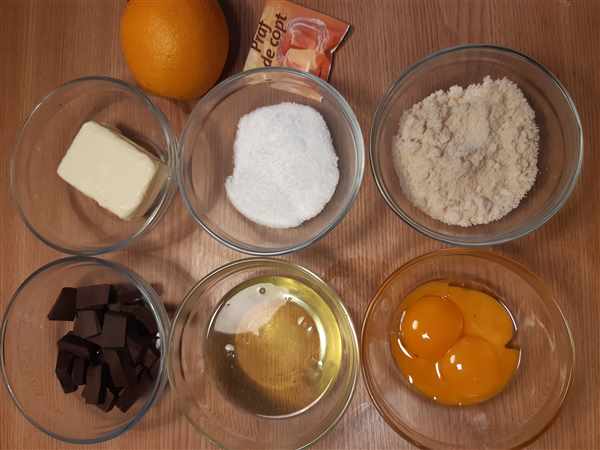 Se separă ouăle iar albușurile se bat spumă cu puțină sare, se adaugă treptat indulcitorul și se continuă baterea până la topirea acestuia. Amestecăm galbenusurile si incorporăm albusurile bătute spumă apoi făina de cocos si nuca macinată in care s-a pus praful de copt. Intr-un vas la bain-marie topim untul si adăugam bucăţele de ciocolată. Amestecăm până obţinem o cremă de ciocolată. Lăsăm putin să se răcească (să nu fie fierbinte), turnăm ciocolata topită peste compoziţie, esenţă de rom, coaja de portocală si amestecăm pentru omogenizare. Se toarnă aluatul într-o formă tapetată cu hârtie de copt si se coace la foc mediu 30 min. Se ornează cu friscă si ciocolată rasă.