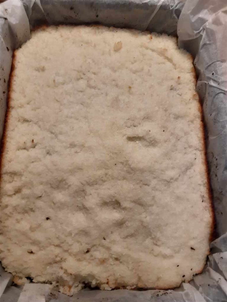 Pentru stratul de cocos: untul îl frecăm cu indulcitorul și cu esenta de vanilie, adăugăm albușurile spumă, cocosul răzuit și puțin lapte.