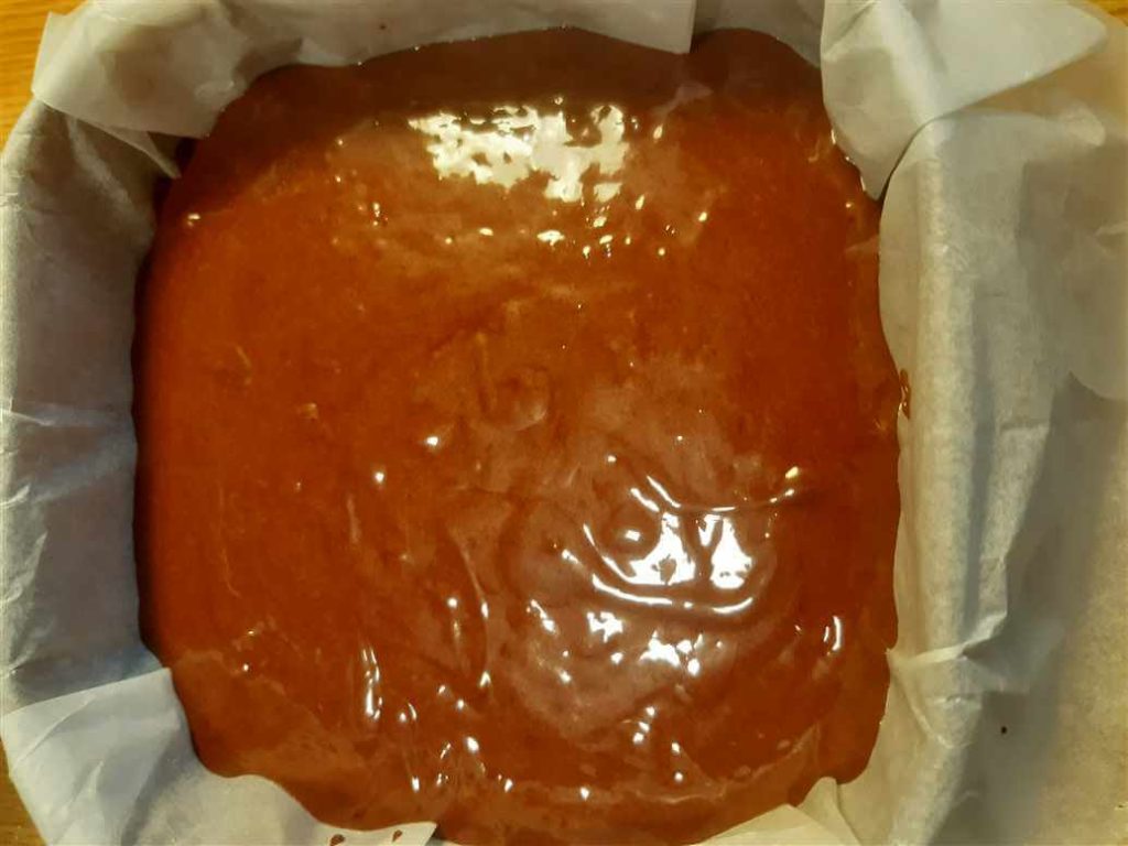Intr-un vas la bain-marie topim untul si adăugam bucăţele de ciocolată. Amestecăm până obţinem o ciocolată fluidă. Lăsăm putin să se răcească (să nu fie fierbinte) si turnăm ciocolata topită peste gălbenusurile frecate cu indulcitor. Incorporăm albusurile bătute spumă in două etape si apoi adaugăm făină de migdale si nucile in care s-a amestecat praful de copt. Amestecăm pentru omogenizare, turnăm compozitia într-o formă tapetată cu hârtie de copt (16,5cm x 16,5 cm) si coacem la foc mediu aproximativ 30 min.