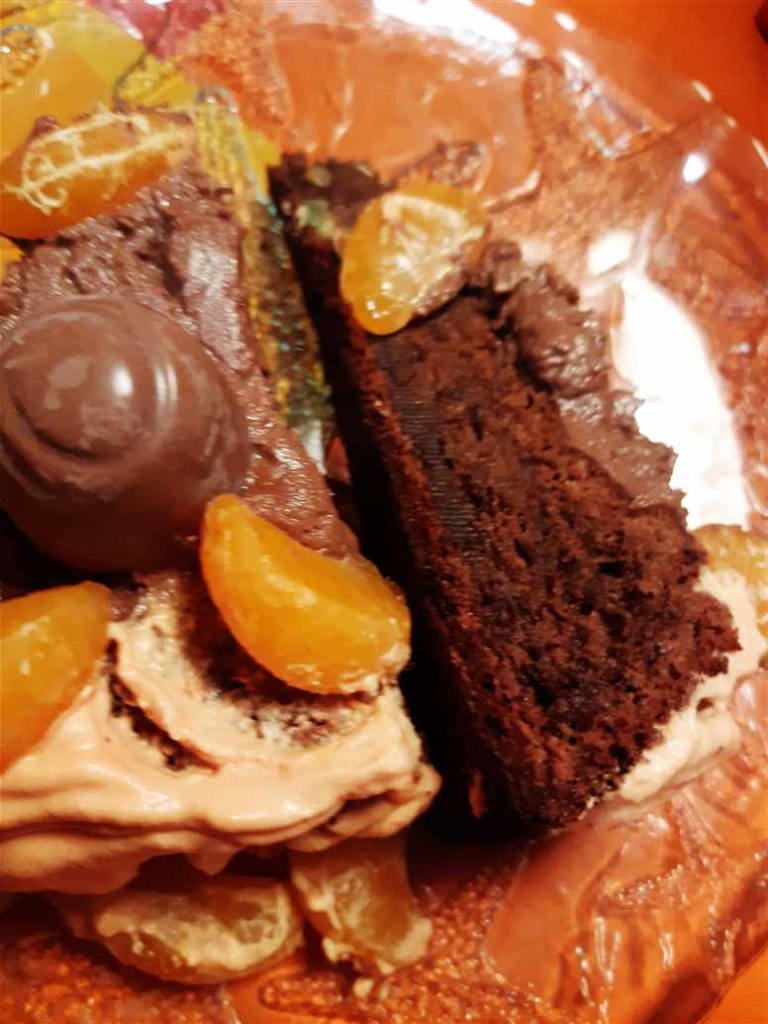 Puneţi crema de ciocolată deasupra blatului, mandarine ,fructul pasiunii şi câteva boamboane de pom fără zahăr, iar pe margine ornaţi cu frişcă şi felii de mandarine.