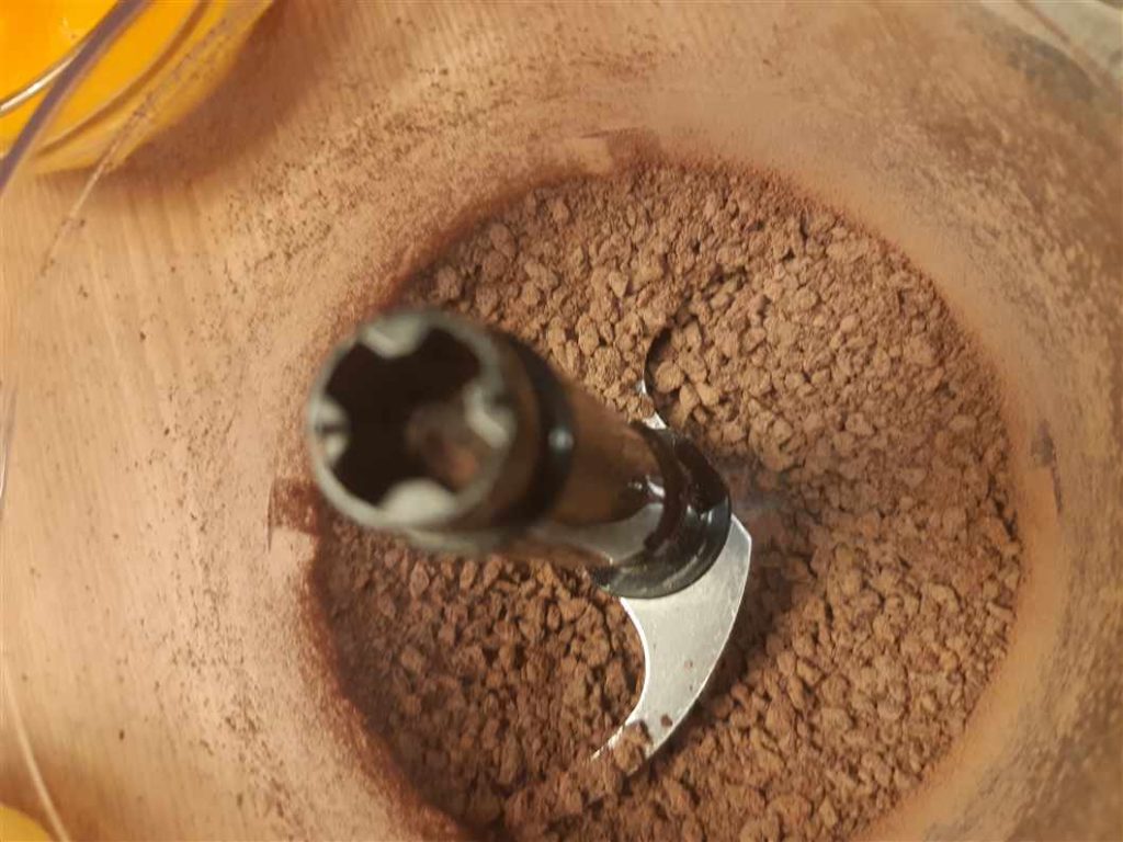 Batem albusurile spumă apoi adăugăm treptat jumătate din indulcitor si mixăm din nou până obtinem o spumă tare si lucioasă. Tocăm cu robotul de bucătărie ciocolata. Amestecăm gălbenusurile cu restul de indulcitor si jumătate din cantitatea de cacao pudră. Turnăm jumătate din sucul de portocale , restul de cacao pudră si amestecăm. Adăugăm sucul rămas si incorporăm treptat făina de migdale in care s-a pus praful de copt , ciocolata maruntită si coaja de portocală rasă. Albusurile băute spumă vor fi adăugate în mai multe tranşe, având grijă să nu se strice spuma si amestecăm cu miscari usoare compozitia.
