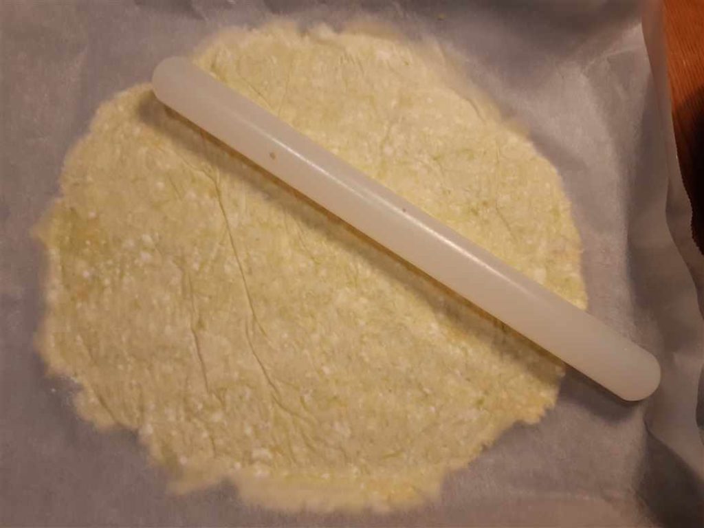 Se amestecă totul pentru omogenizare și se formează o bilă din compoziție  care  se pune pe o tavă cu hârtie de copt.  Așezăm peste compoziție o altă hârtie de copt și întindem cu un sucitor astfel încât  obținem un blat de pizza.